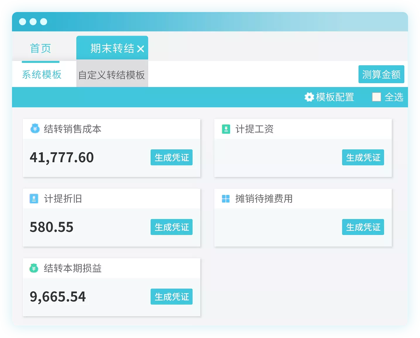 自动生成损益凭证、成本结转凭证、计提折旧凭证,期末结转再也不会出错;