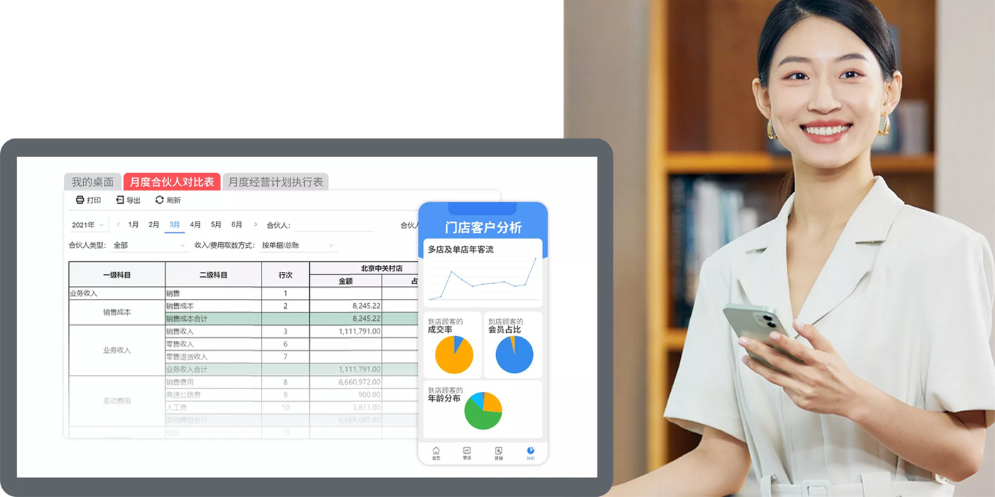 【分析经营全貌】全面人财货客经营分析报表,实时了解员工业绩,掌握财务资金、流水、账款,统计商品的销量、利润及周转,防止客户流失等。